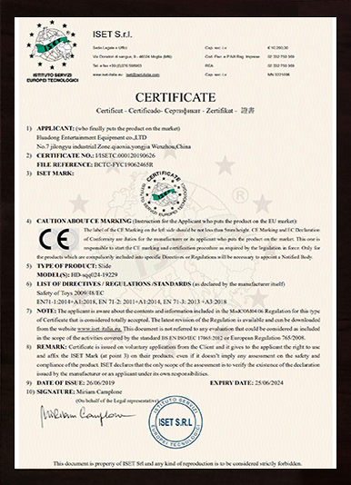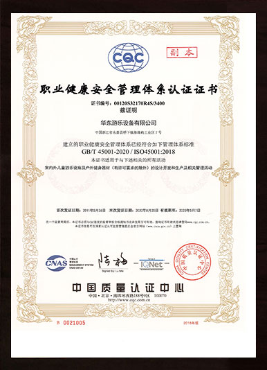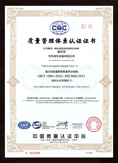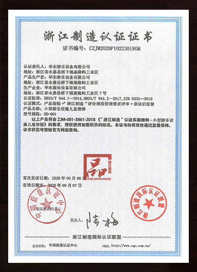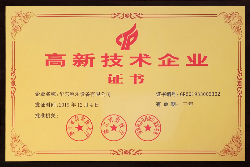 華東游樂的產品先后通過ISO國際質量管理、ISO環境管理、職業健康安全管理、安全生產標準化、知識產權管理體系、德國TUV、3C、SGS等國家和國際權威認證,公司先后被相關政府評為高薪技術企業、巨龍企業、知名商標、永嘉縣“縣長質量獎”、明星企業、高成長型企業等榮譽稱號!